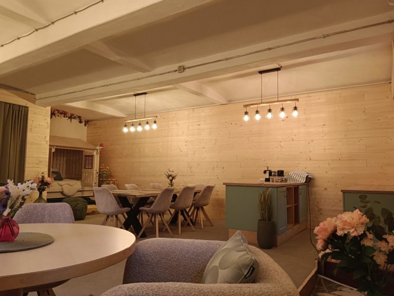 Bei Schlechtwetter können wir euch unseren großzügigen Gemeinschaftsraum anbieten. Den gibt es einerseits indoor und genauso gerne könnt ihr unseren überdachten Partytisch nutzen.